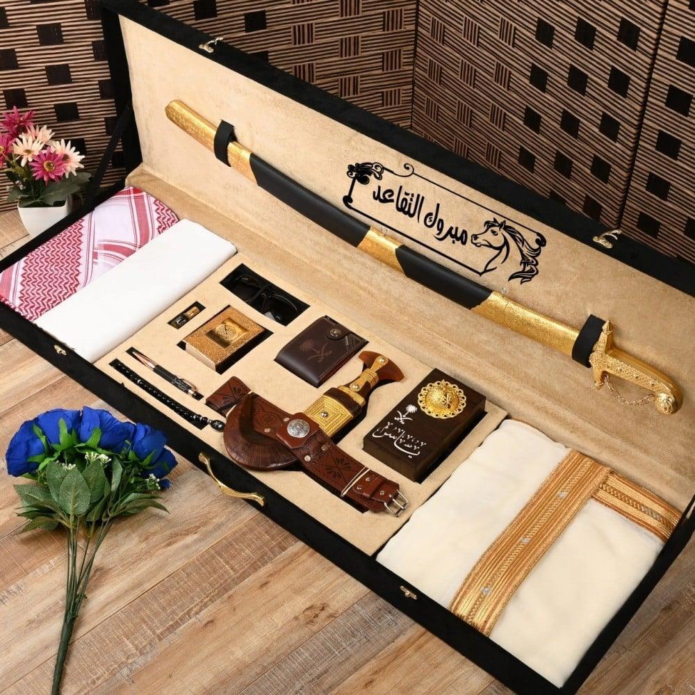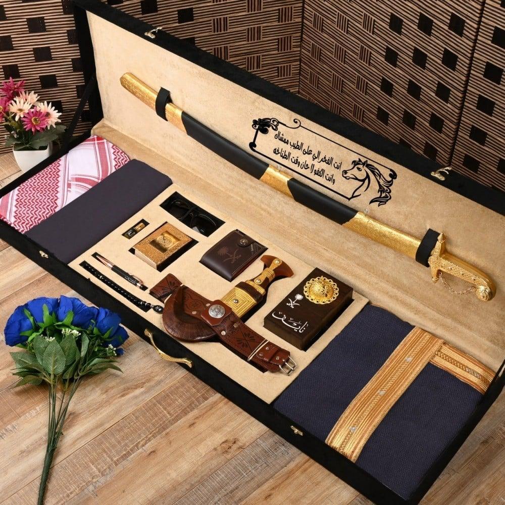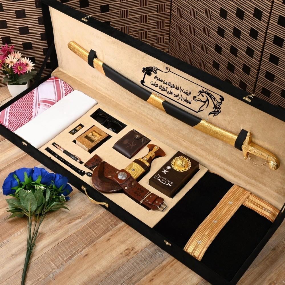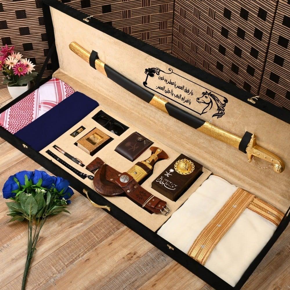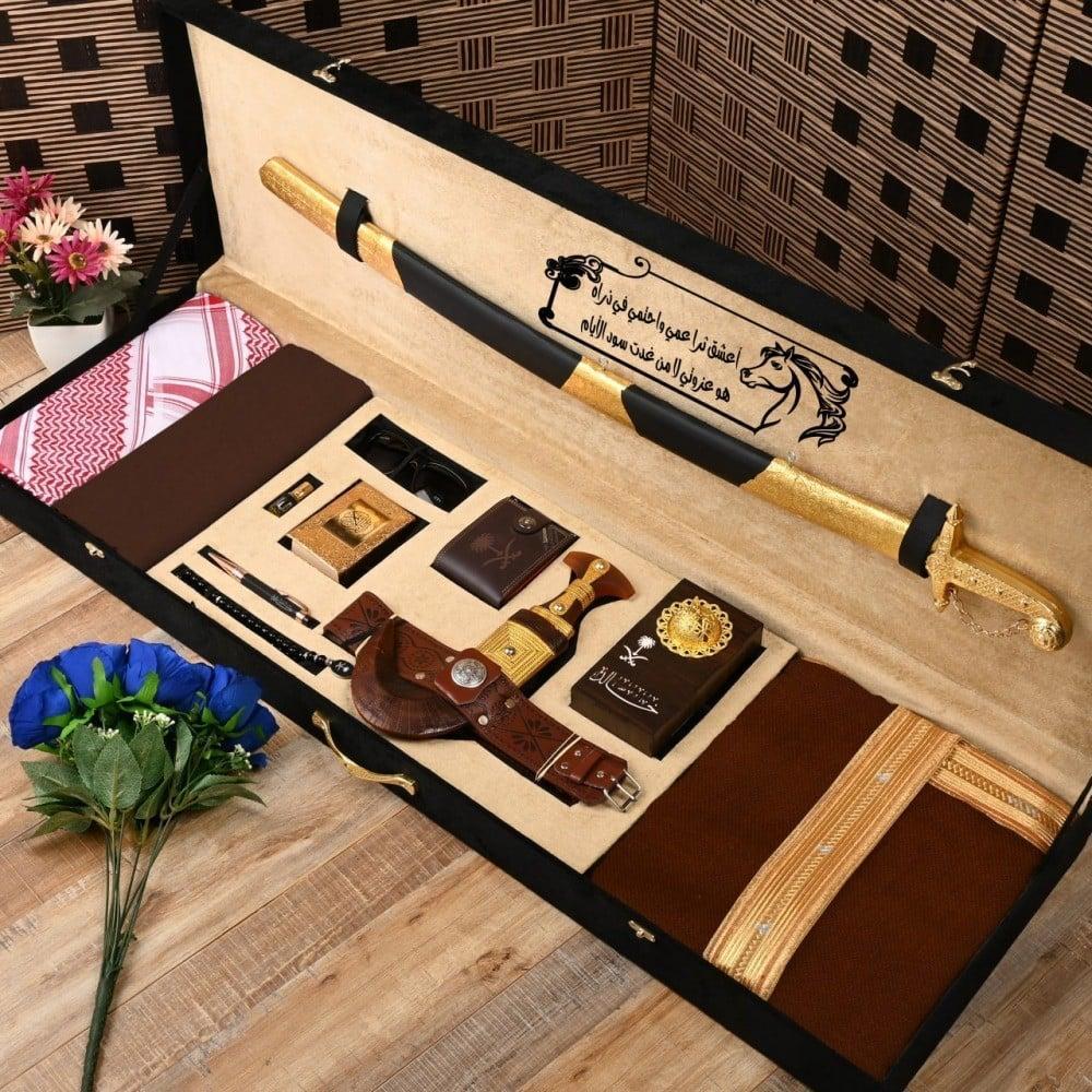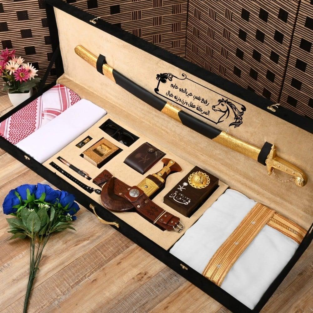 طقم رجالي فاخر يجمع تقليد الأصالة مع الفخامة. يحتوي على سيف مزخرف، خنجر (جنبي) بتصميم عربي تراثي، شماغ وعقال، قماش رجالي، محفظة أنيقة، مسباح، نظارة وإكسسوارات راقية — كلها مرتبة داخل علبة هدية فاخرة. خيار مثالي كهدية زواج، تخرج، ترقية أو احتفال خاص.