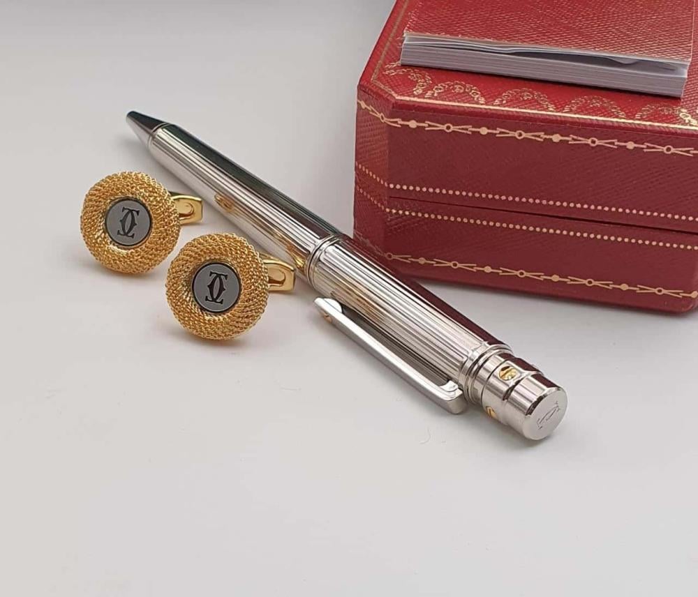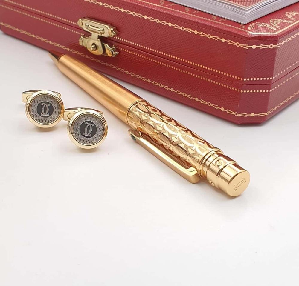 امتلك طقم قلم وكبك ماركة كارتير الفاخر، يجمع بين التصميم الكلاسيكي والفخامة العملية. مثالي لإكمال إطلالتك الرسمية أو كهديّة راقية، مصنوع من خامات عالية الجودة بتفاصيل دقيقة تعكس الفخامة والرقي.