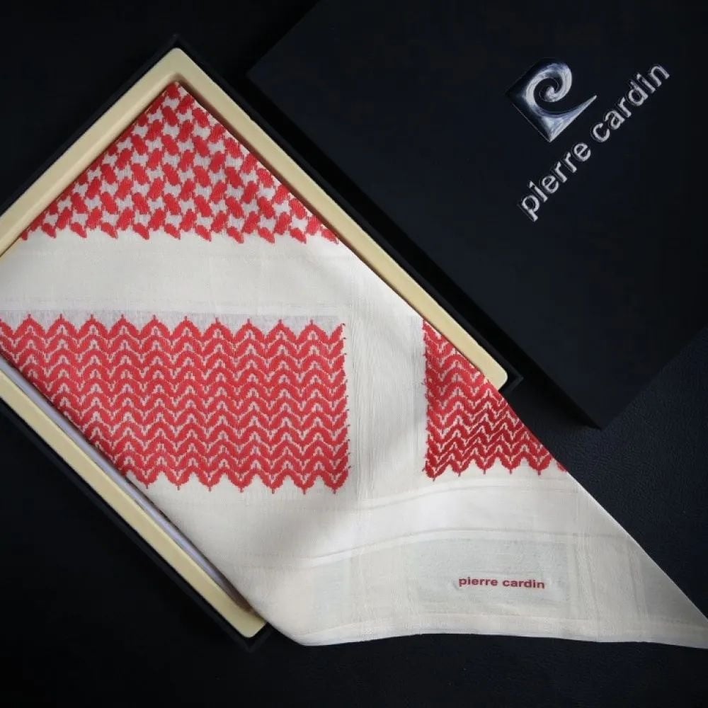 شماغ بيير كاردان شماغ انجليزي الصنع ذات التصميم المميز جدا الخاص به من النقوش المتداخلة بين اللونين الأبيض والأحمر