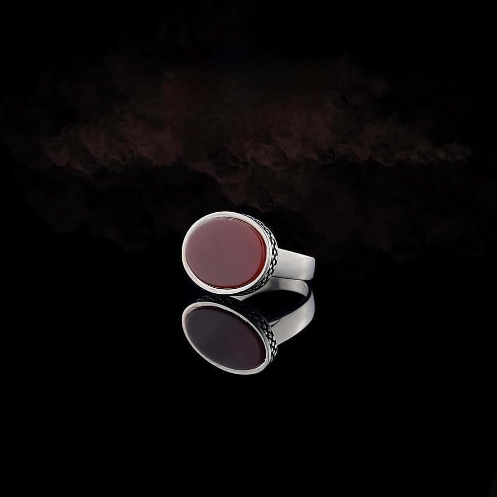 ارتقي بأناقتك مع خاتمنا الملكي الفاخر قطعة فريدة تجمع بين الأصالة والرقي. يزين الخاتم حجر عقيق أحمر داكن بيضاوي الشكل يشع بجمال آسر محاط بإطار من الفضة المصقولة بعناية. يعتبر هذا الخاتم رمزاً للتميز والفخامة مناسباً للمناسبات الخاصة واليومية.