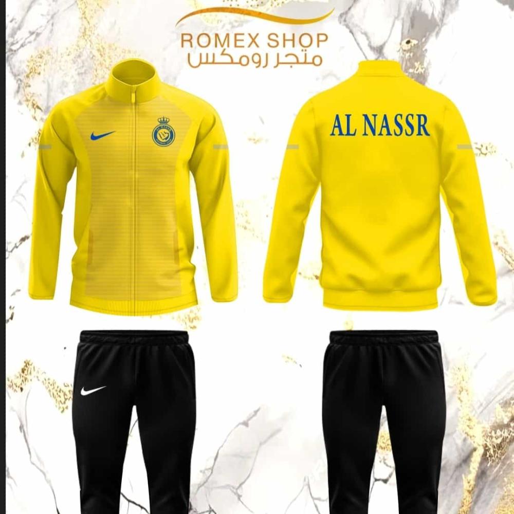 طقم النصر الجديد يبرز بتصميمه الأنيق والمتطور، حيث يتألق الجزء العلوي بلون أبيض ناصع، مزين بشعار النادي بألوانه الزاهية على الجهة اليمنى وشعار Nike الشهير على الجهة اليسرى. تتميز الجاكيت بخطوط رفيعة على طول الأكمام، مضفية عليها لمسة من العصرية. ويكتمل الطقم ببنطلون أسود فاخر يحمل شعار Nike بلون متباين على الجهة اليسرى، مع حواف مرنة لضمان الراحة والأناقة.